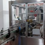 I contenitori vengono alimentati in file singole all’interno della macchina tramite un nastro trasportatore che attraversa l’intera macchina.